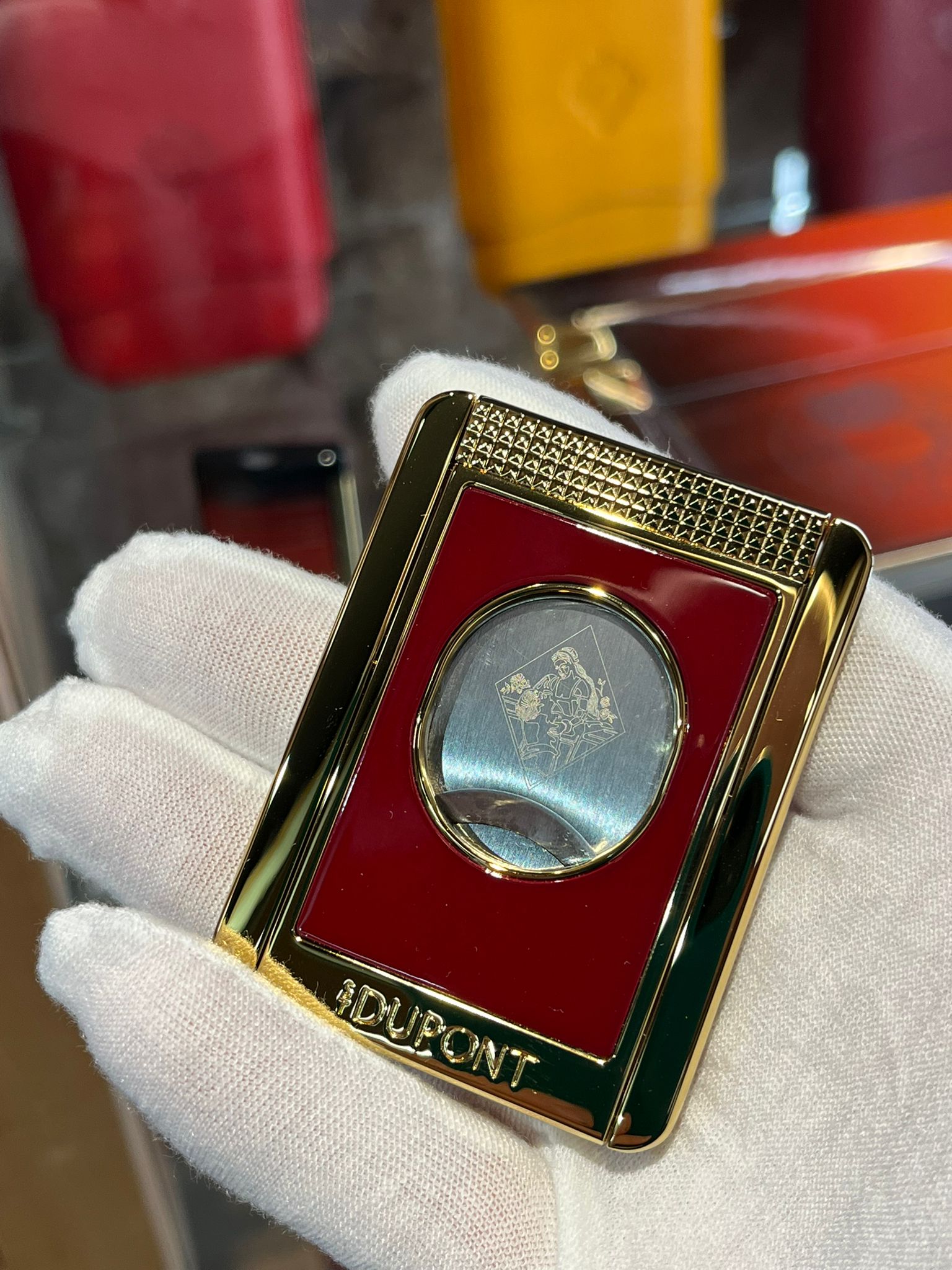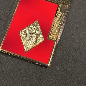 – Acabamento em laca vermelha e detalhes dourados